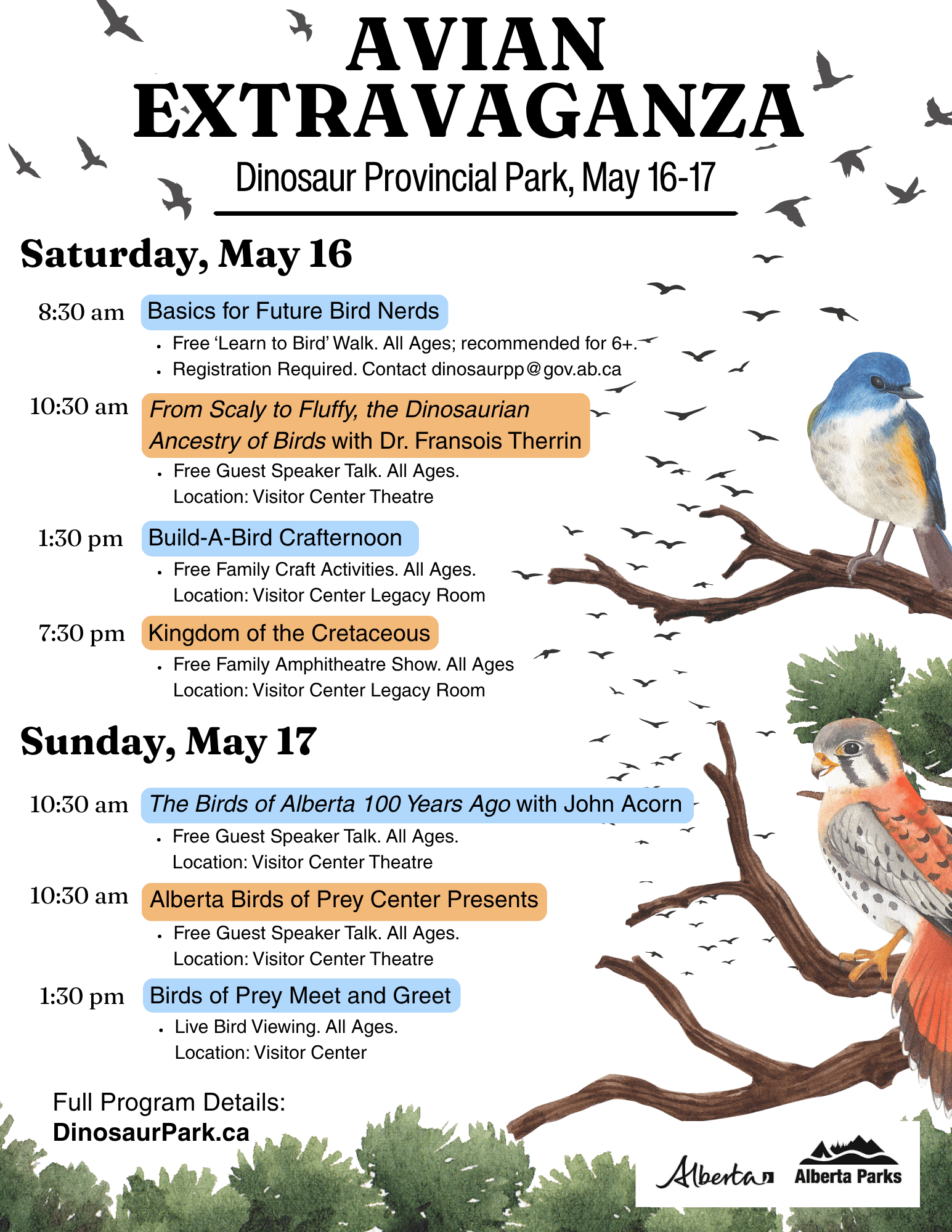 Celebrate the incredible world of birds at the Avian Extravaganza, happening May 16–17 at Dinosaur Provincial Park! This two-day event is packed with fun, family-friendly activities that explore the fascinating connection between dinosaurs and modern-day birds.